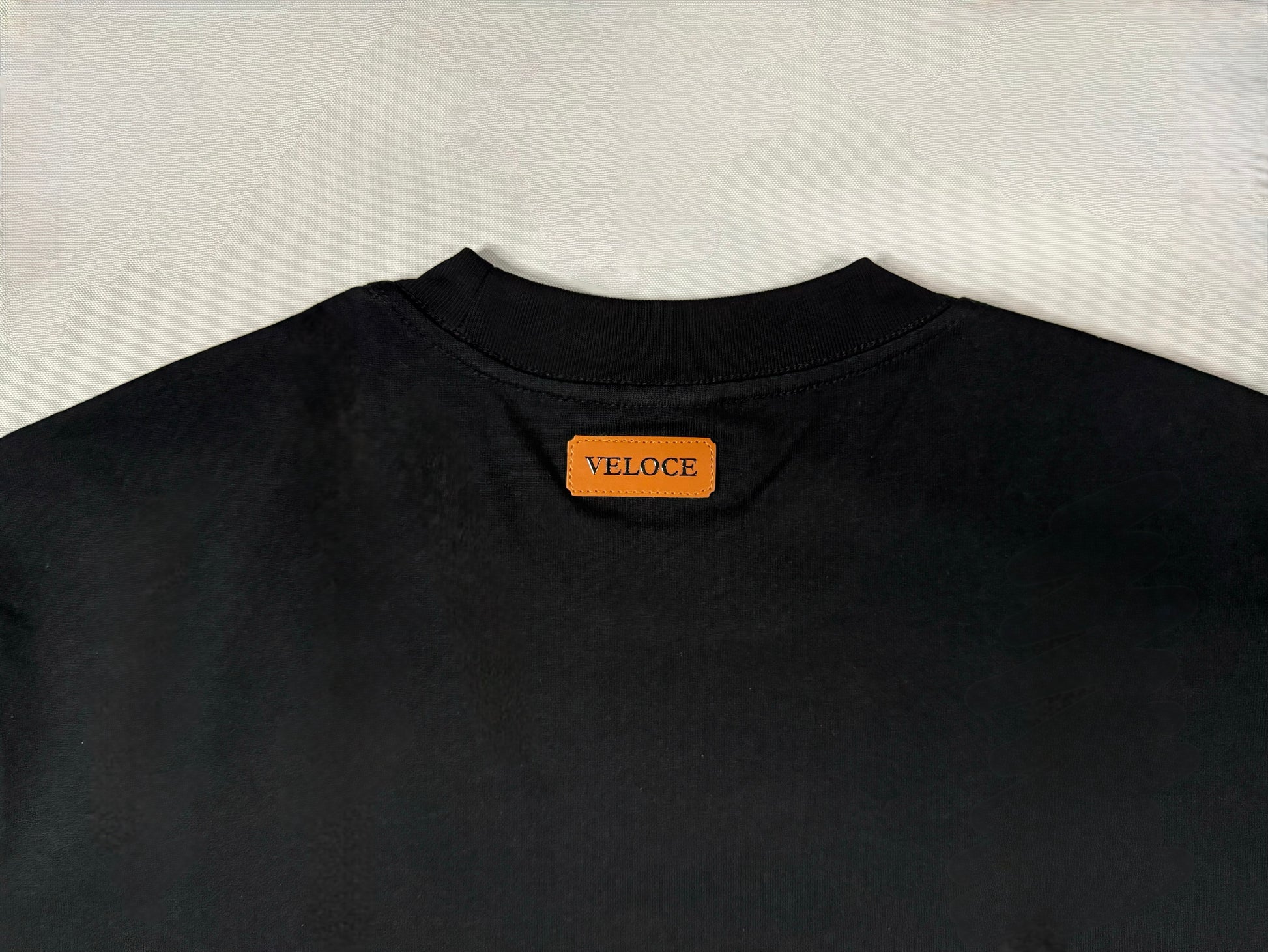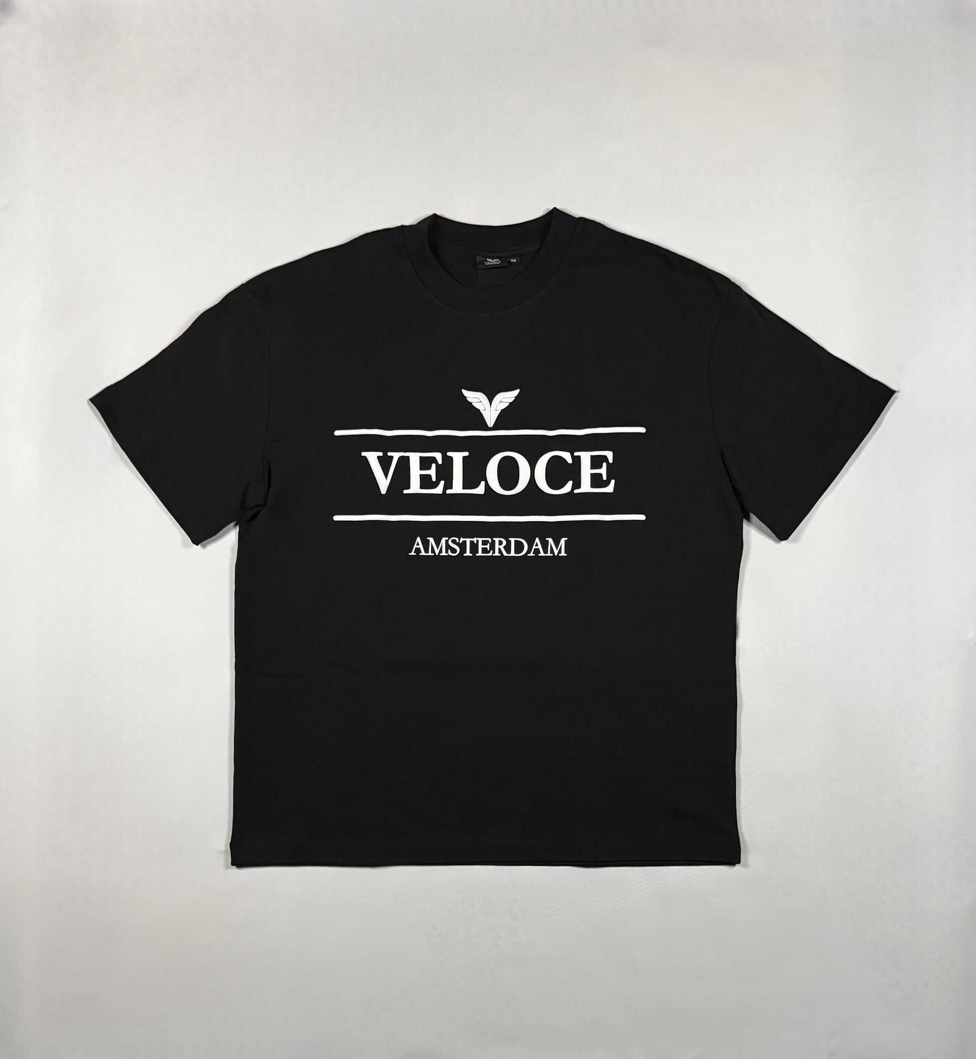 De essentie van tijdloze klasse — het zwarte oversized T-shirt van Veloce Amsterdam combineert minimalistisch design met ultieme verfijning.